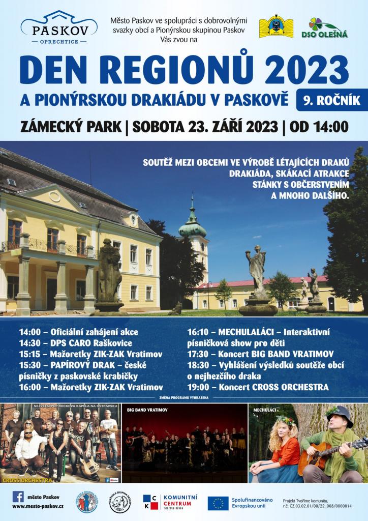 Město Paskov ve spolupráci s dobrovolnými svazky obcí a Pionýrskou skupinou Paskov Vás zvou na 9. ročník akce DEN REGIONŮ 2023 v sobotu 23. září 2023
