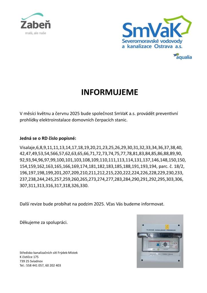 V měsíci květnu a červnu 2025 bude společnost SmVaK a.s. provádět preventivní prohlídky elektroinstalace domovních čerpacích stanic. Děkujeme za spolupráci.