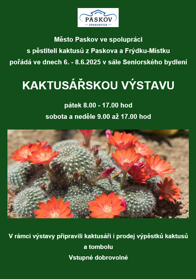 Město Paskov ve spolupráci s pěstiteli kaktusů z Paskova a F-M pořádá ve dnech 6.-8.6.2025 v sále Seniorského bydlení.