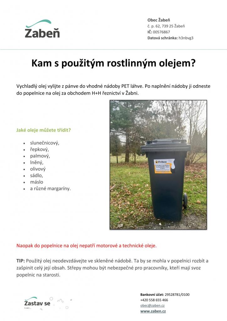 Po naplnění PET láhve ji odneste do popelnice na olej za obchodem H+H řeznictví v Žabni. Děkujeme, že třídíte.