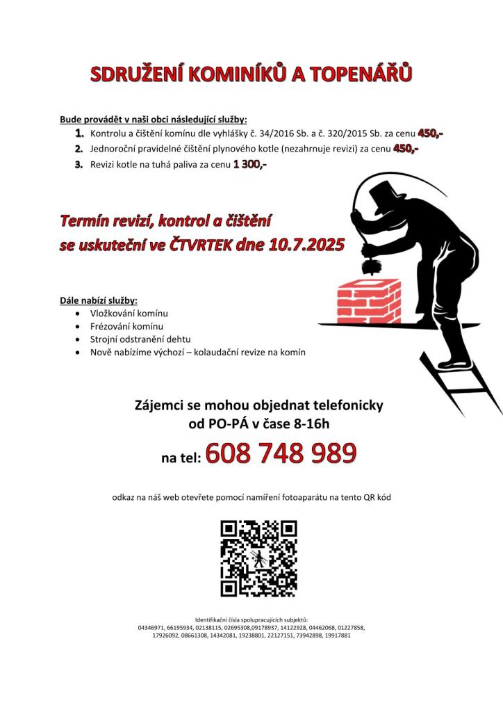 Termín revizí, kontrol a čištění se uskuteční ve čtvrtek 10.07.2025 Kontakt: 608 748 989