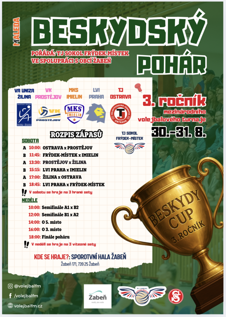 Ano, je to tak 30.–31. srpna 2025 se naše sportovní hala v Žabni stane dějištěm prvního mezinárodního volejbalového turnaje!🔥