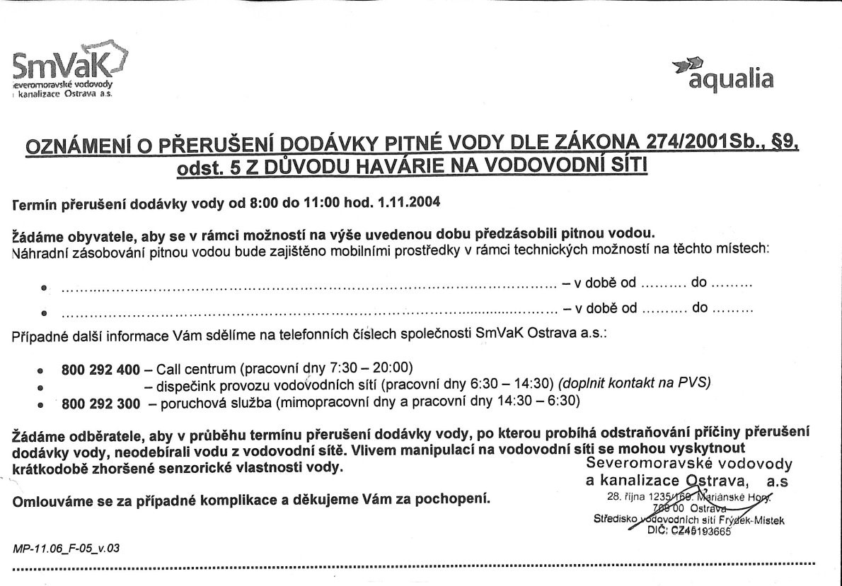 o přerušení dodávky pitné vody dle zákona č. 274/2001 Sb., § 9, odst. 5 z důvodu havárie na vodovodní síti 1. listopadu 2024 od 8:00 do 11:00 hodin.