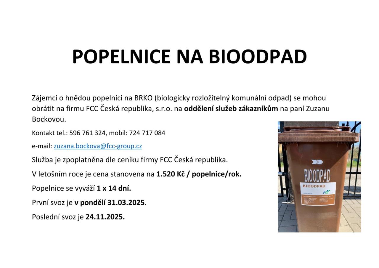 Zájemci o hnědou popelnici na BRKO (biologicky rozložitelný komunální odpad) se mohou obrátit na firmu FCC ČR, s.r.o na odd. služeb zákazníků na tel.:724 717 084, 596 761 324