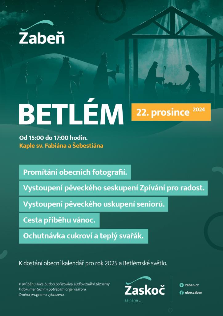 Obec Žabeň srdečně zve na betlém 12. prosince 2024 od 15:00 hodin u Kaple sv. Fabiána a Šebestiána.