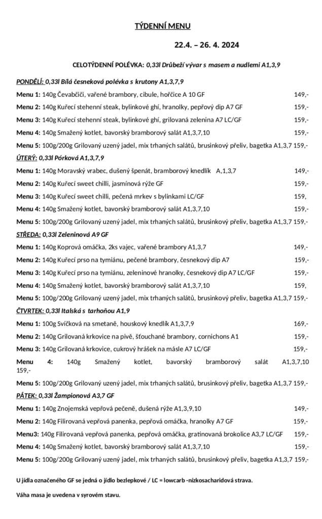 Týdenní menu 22.04. - 26.04.2024 Facebook: Aero U Čápů