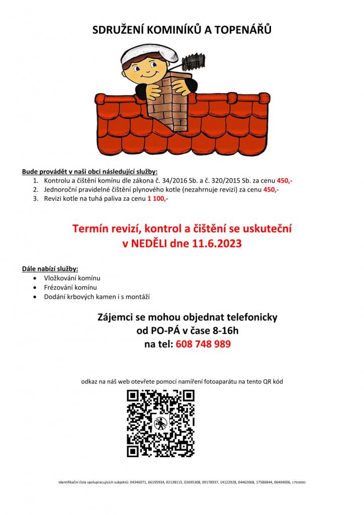 Bude provádět v naší obci v NEDĚLI dne 11.6. požadované kontroly a čištění komínů dle zákonu č. 34/2016 Sb. za 450 Kč, čištění plynových kotlů za 450 Kč a revize kotlů na tuhá paliva za 1 100 Kč. Dále nabízí vložkování, frézování komínů a dodání krbových kamen i s montáží.