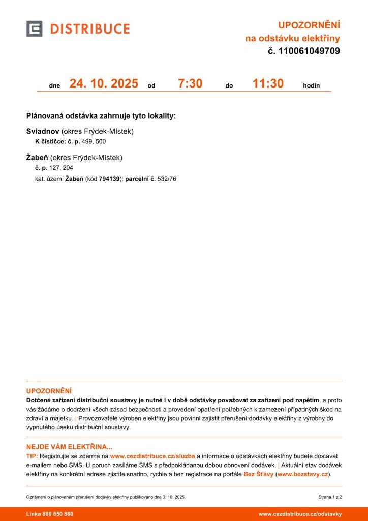 24. října 202 Odstávka elektřiny se týká č.p. 127 a č.p. 204.