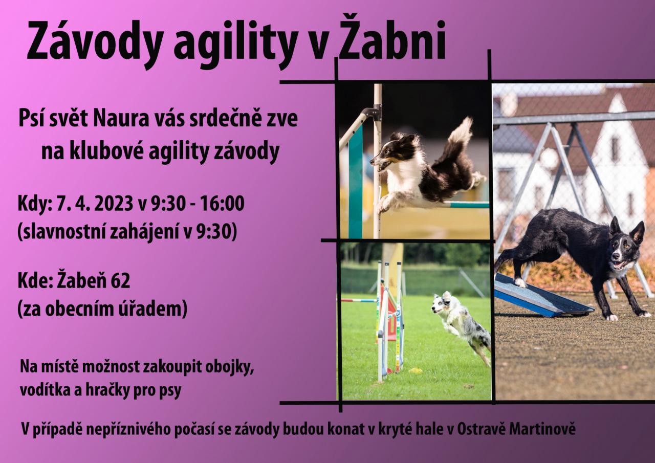 Kvůli nepříznivé předpovědi počasí se zítřejší závody přesouvají do haly v Ostravě. Pejskům by to v dešti a sněhu klouzalo. V Žabni se budou konat závody opět na podzim, konkrétně 15.10.2023