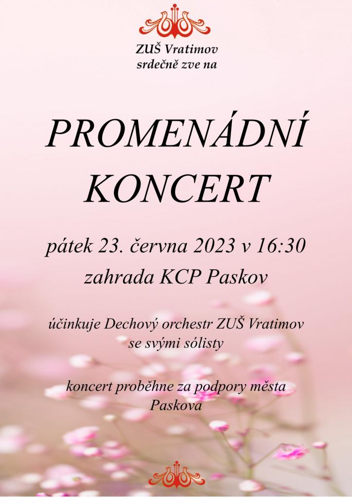 PROMENÁDNÍ KONCERT pátek 23. června 2023 v 16:30 hodin, zahrada KCP Paskov účinkuje Dechový orchestr ZUŠ Vratimov se svými sólisty. Koncert proběhne za podpory města Paskova.